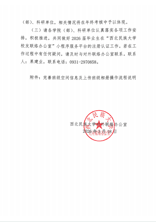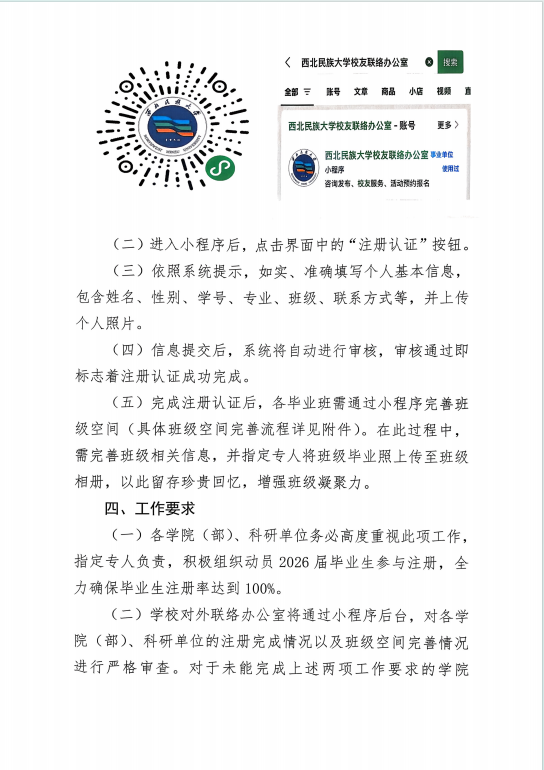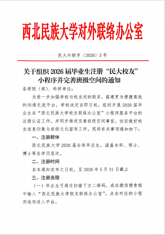 关于组织2026届毕业生注册“民大校友”小程序并完善班级空间的通知