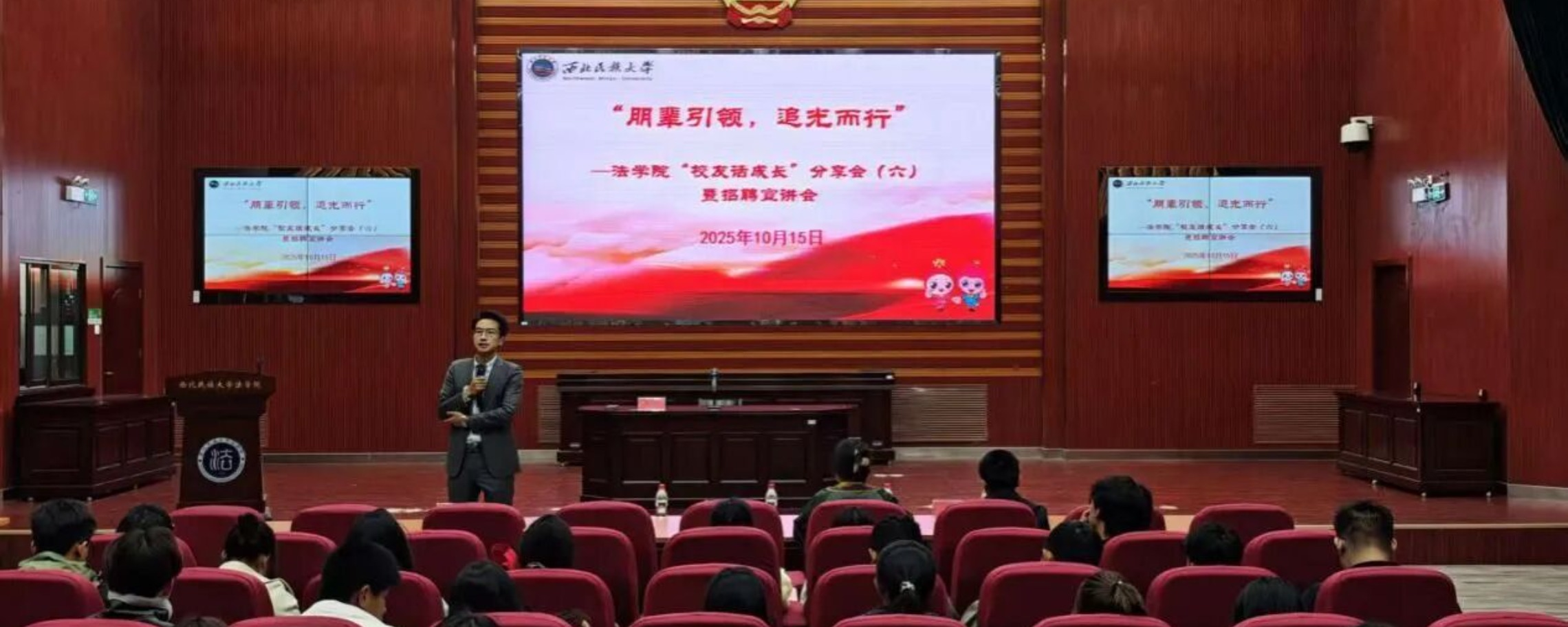 为充分发挥优秀校友的榜样引领作用,帮助学生明确职业目标,同时为毕业生提供就业机会。10月15日,法学院在模拟法庭举办“朋辈引领,追光而行”—“校友话成长”分享会暨招聘宣讲会。本场活动特邀2019届法学专业校友、甘肃荣庆律师事务所律师禹宁宁分享并进行招聘宣讲,由法学院副院长祁全明主持。分享会上,禹宁宁结合自身在校学习及职业发展路径强调,大学期间不仅要全面掌握专业知识,系统构建知识体系,更应注重思想修养与体魄健康的同步提升,做到全面发展。同时,要明晰自我认知,提前为就业与未来发展做好准备。在随后的招聘宣讲环节