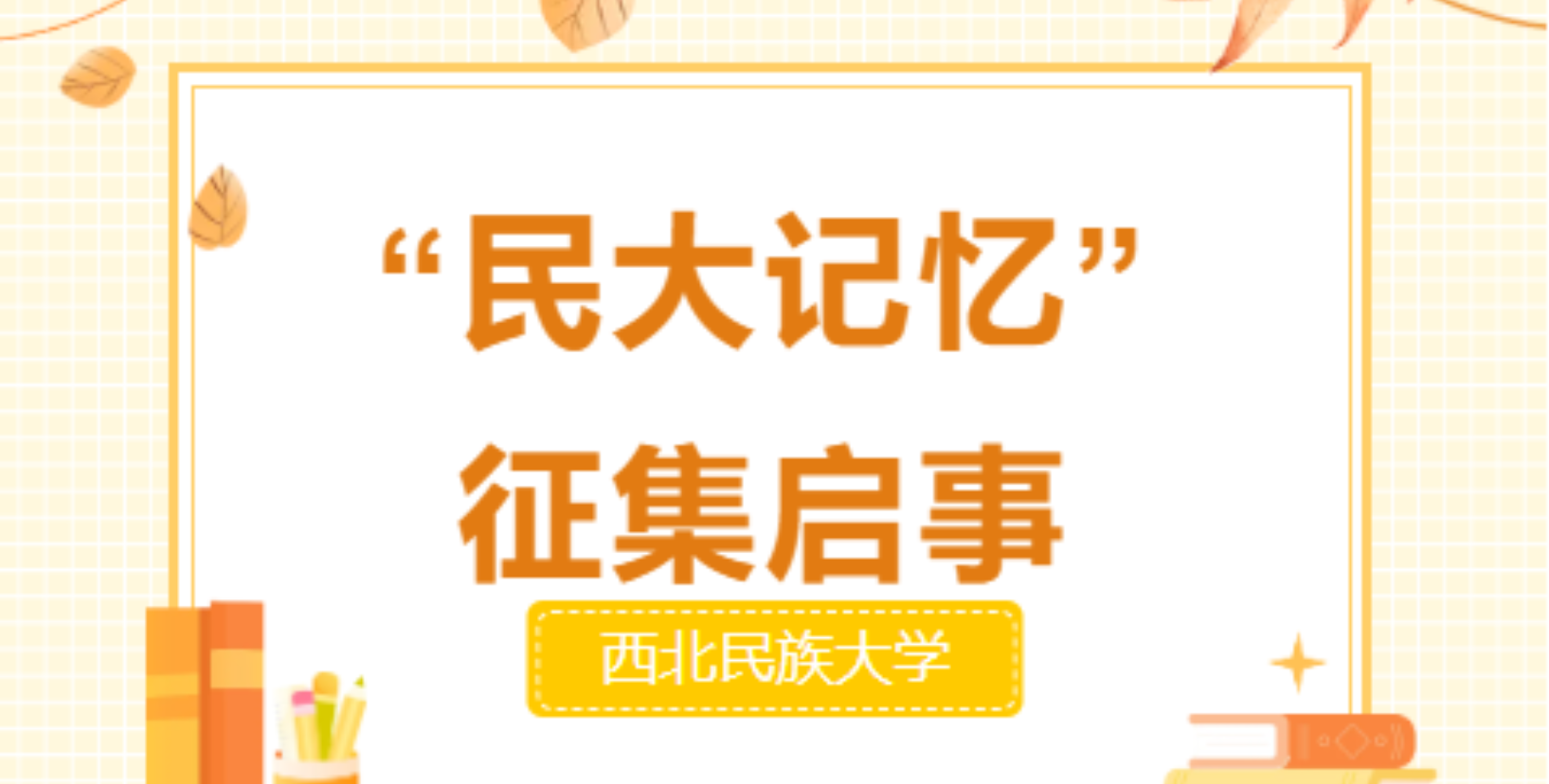 75载弦歌不辍,无数民大学子从这里出发,将青春足迹印刻在校园的每一个角落,也将与母校的羁绊藏进一张张照片、一件件旧物里。如今,西北民族大学校友之家正致力于打造“校友共同的精神家园”,为让这份“民大记忆”有处安放、代代传递,现面向全社会公开征集承载学校历史、校友情感的老照片与老物件,让每一份珍贵印记在校友之家绽放光彩,陪伴更多校友“回家”时重拾青春。1征集内容本次征集聚焦“民大发展历程”与“校友成长故事”,所有物品经整理后将集中陈列于西北民族大学校友之家,具体类别如下:1老照片:定格民大时光1.校园变迁类。